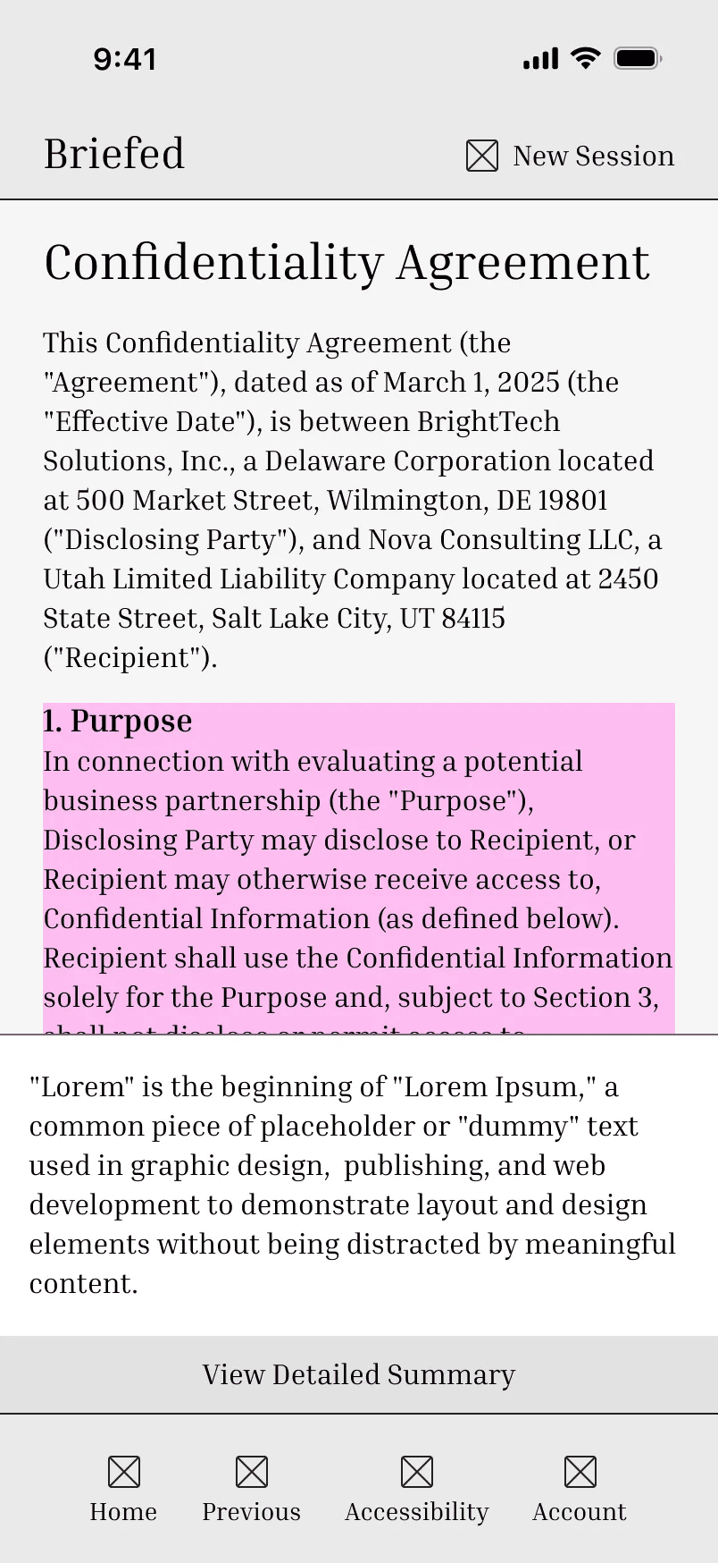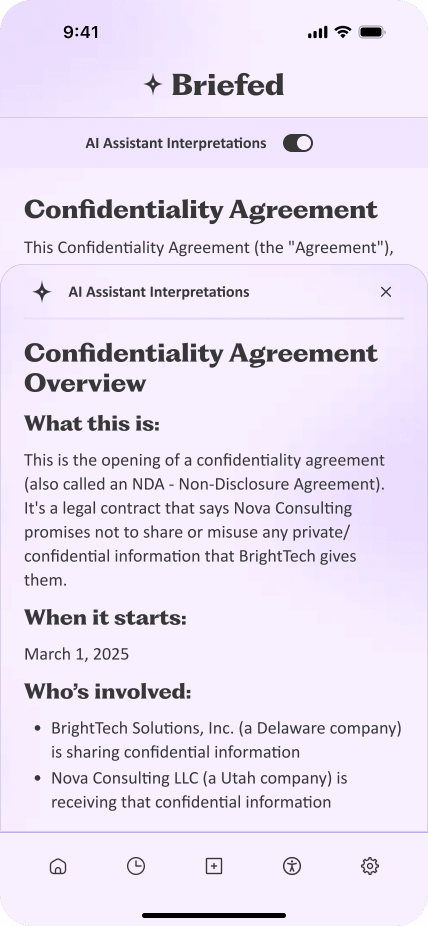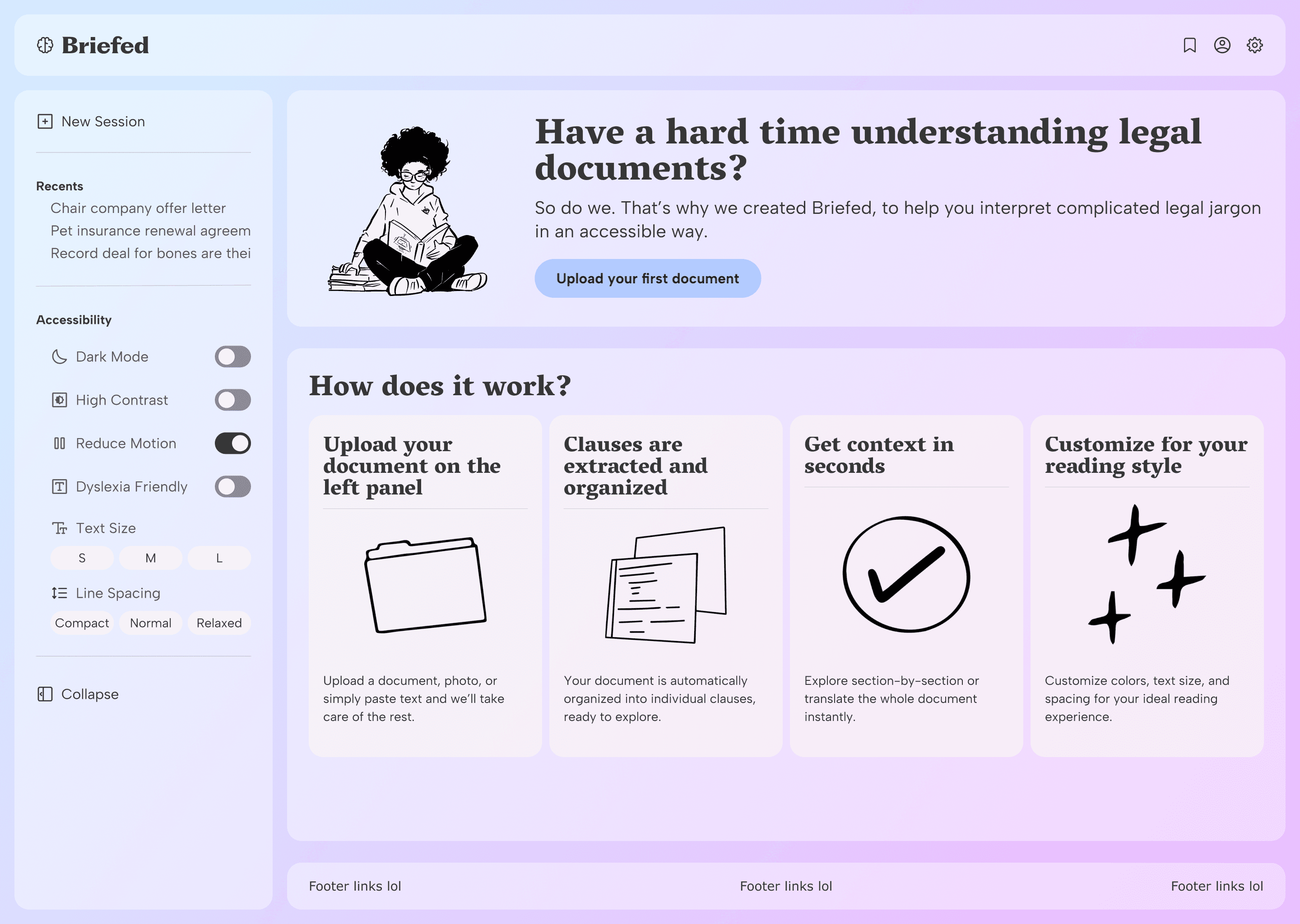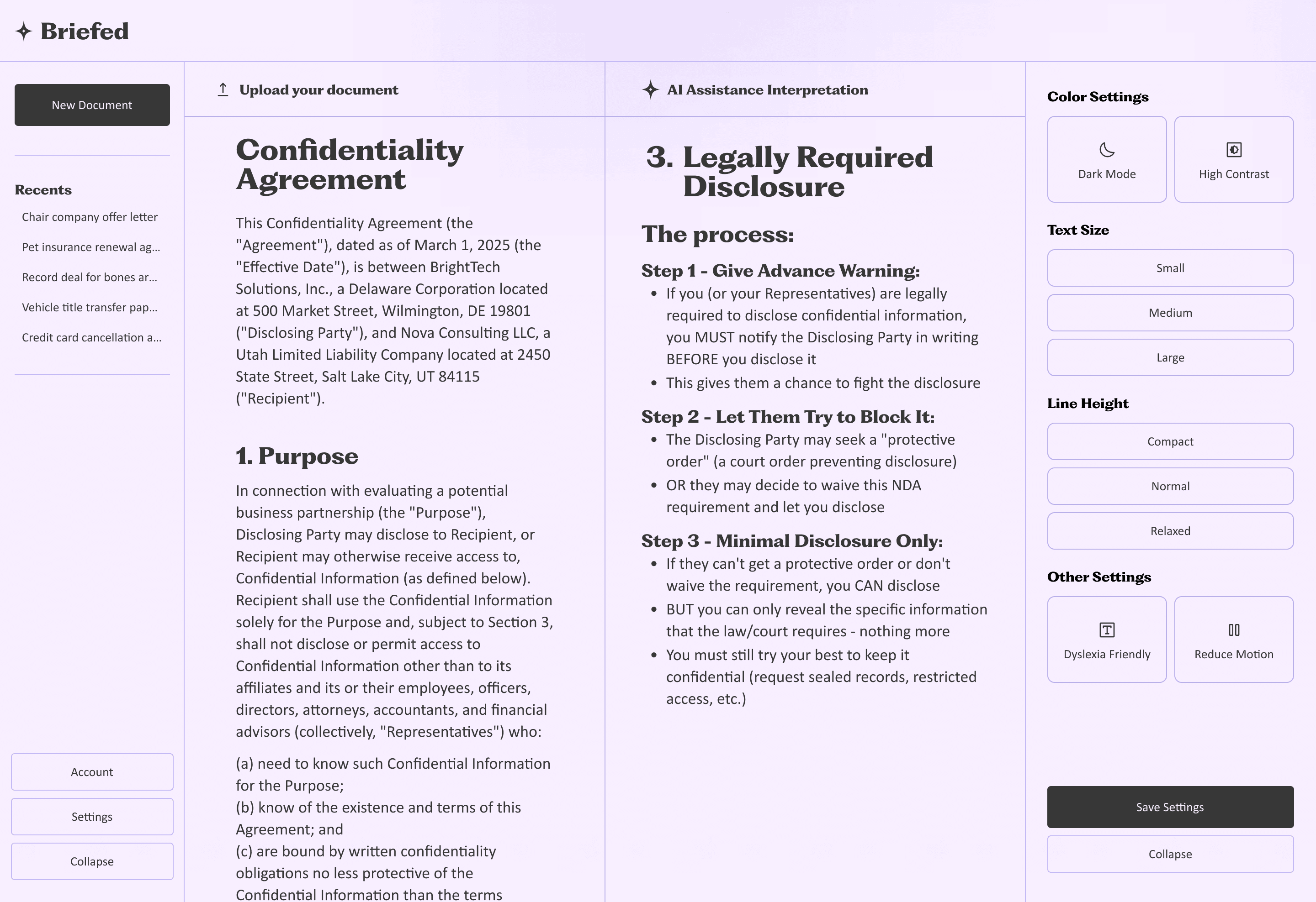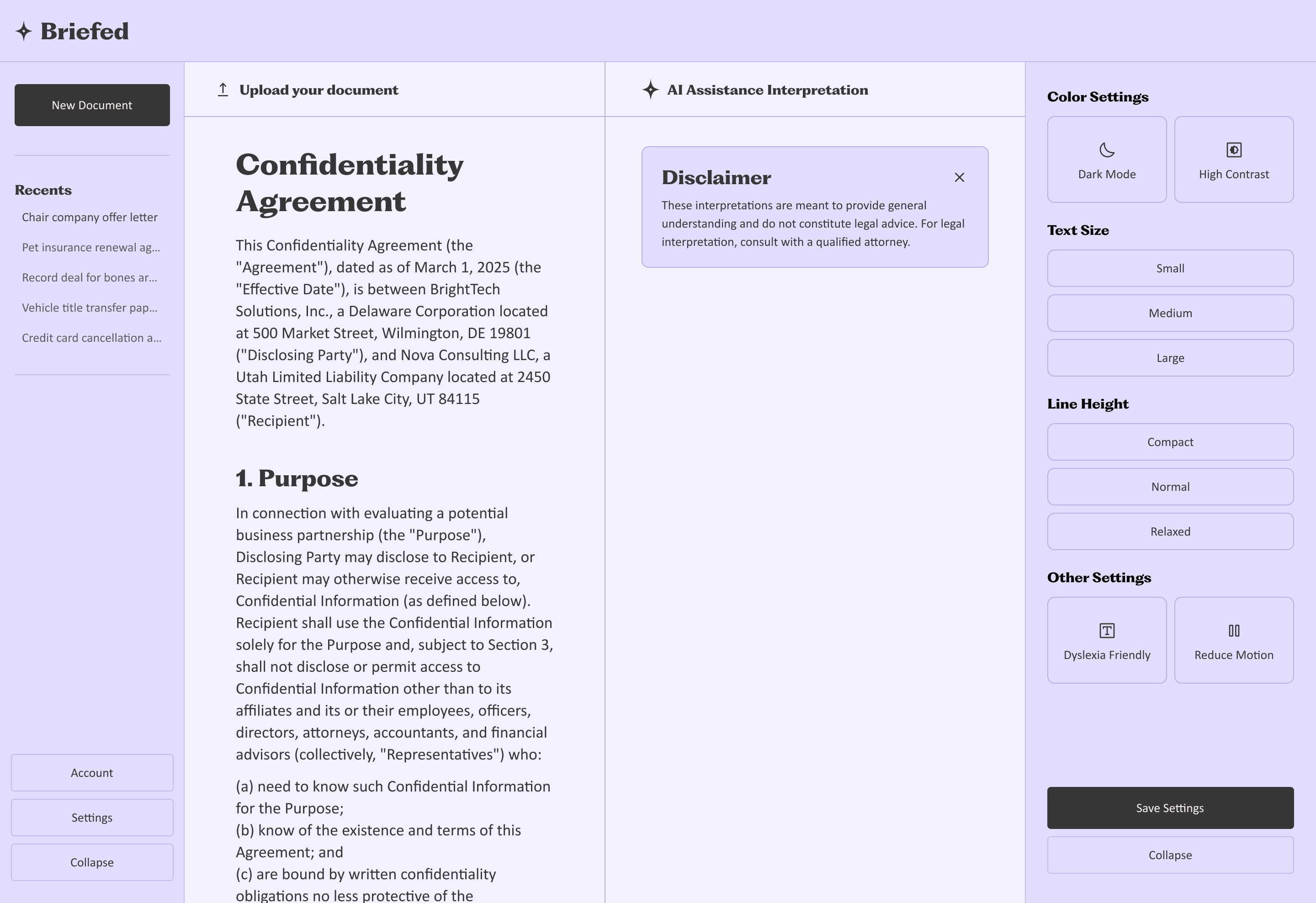 An AI tool that translates legal documents into plain language with section summaries and accessibility controls.