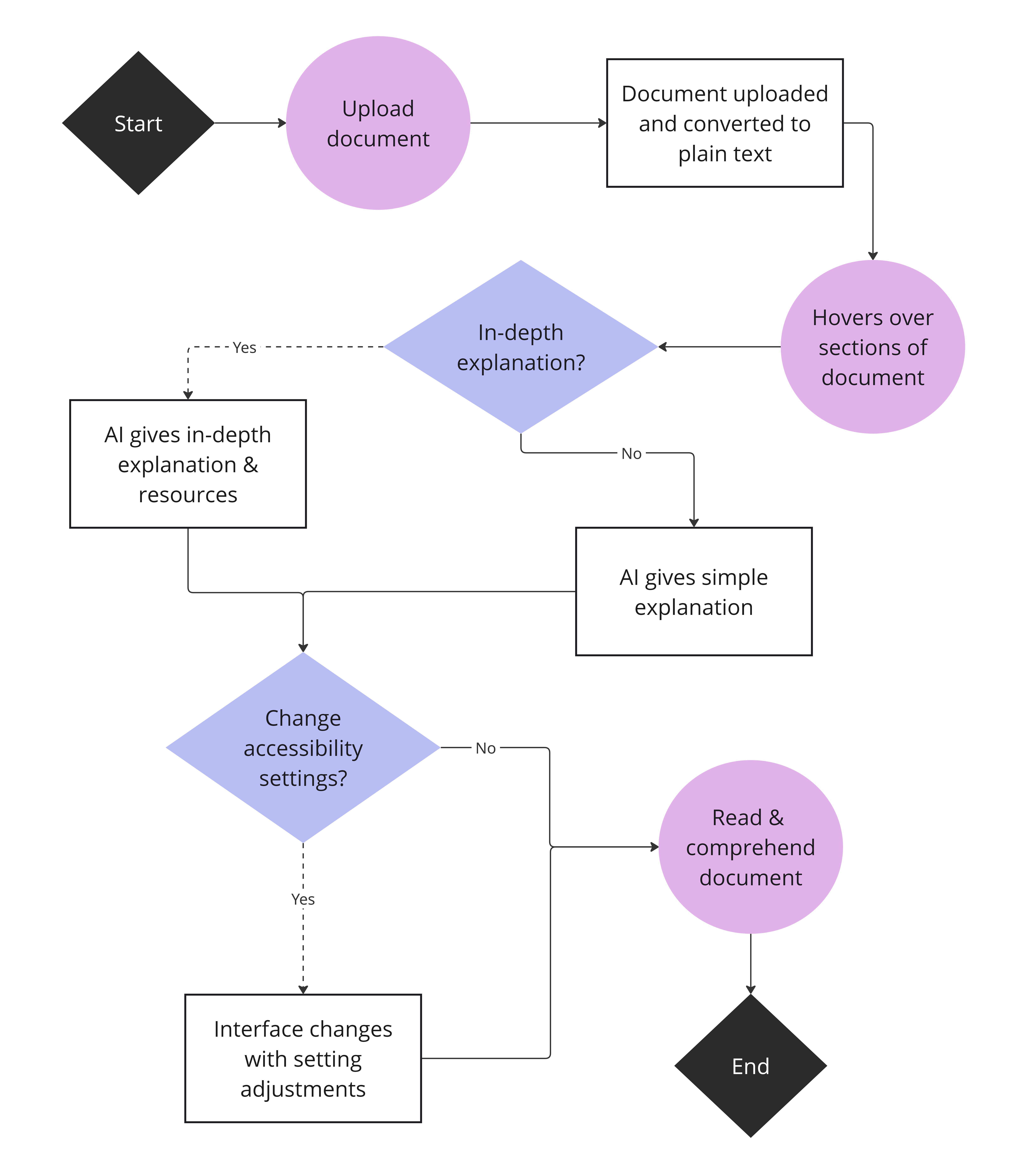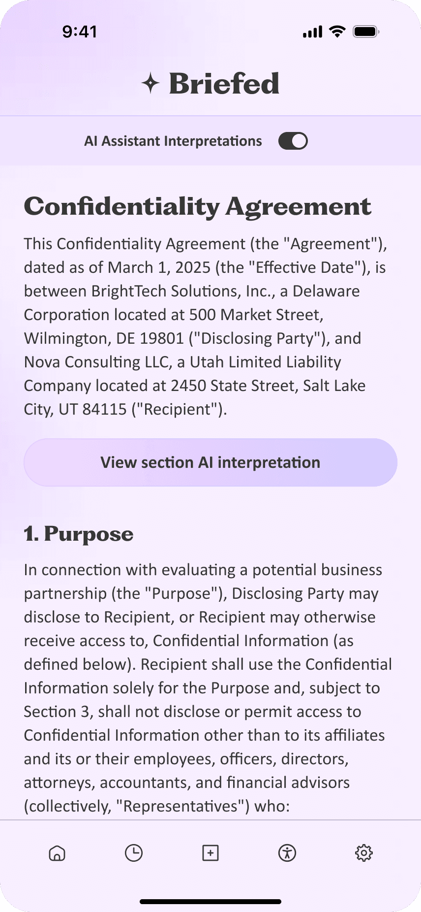 Documents that the users upload are converted to plain text, allowing screen readers to function properly and for accessibility settings to apply. The AI tool will separate the document into clauses and translate those sections for the user.