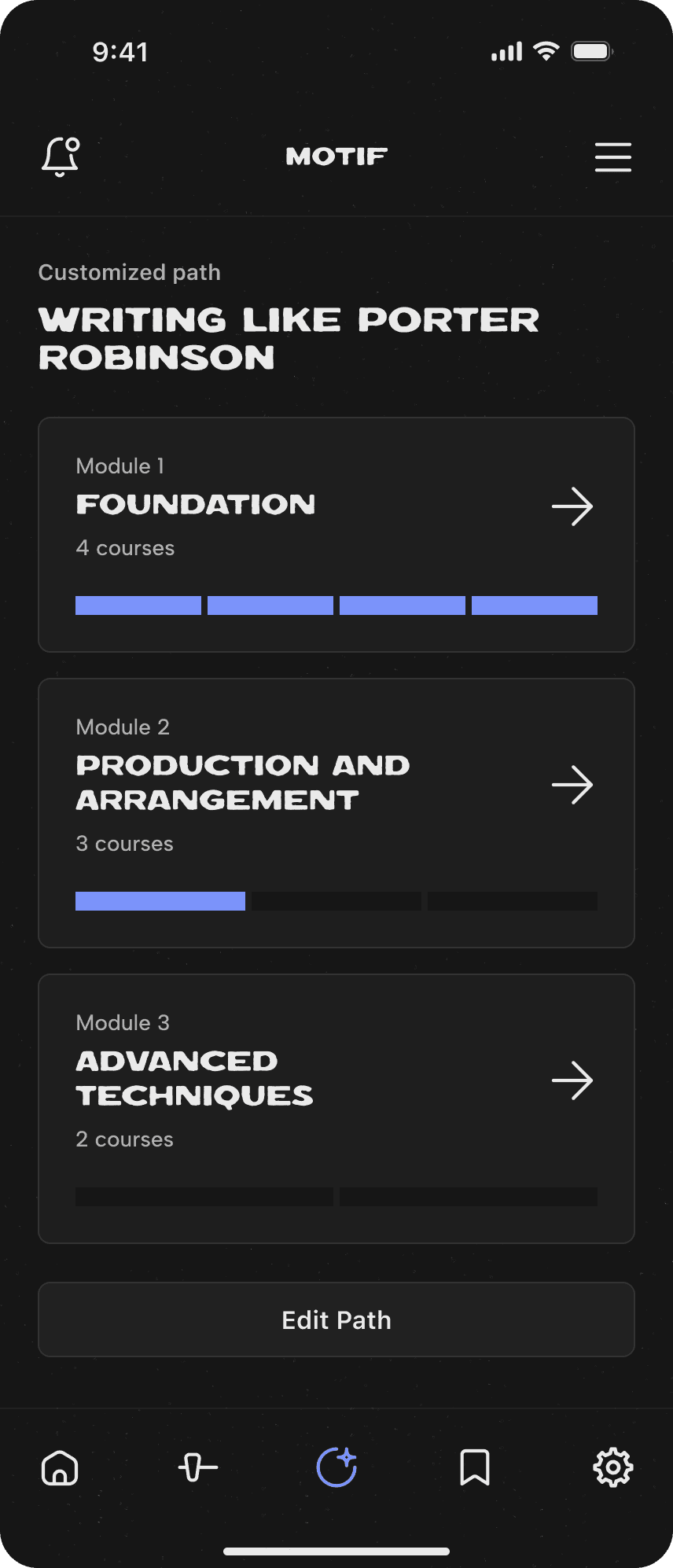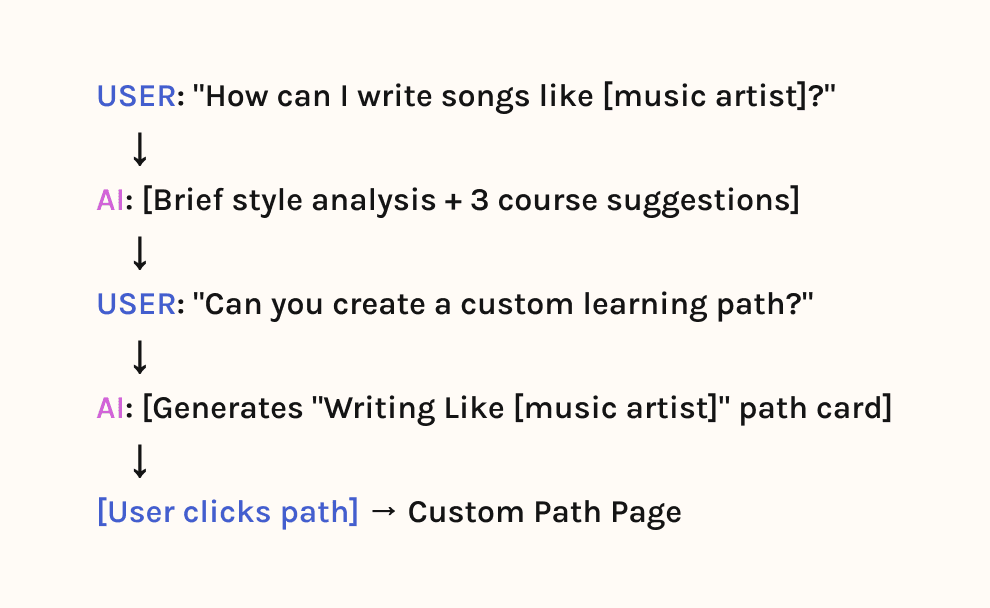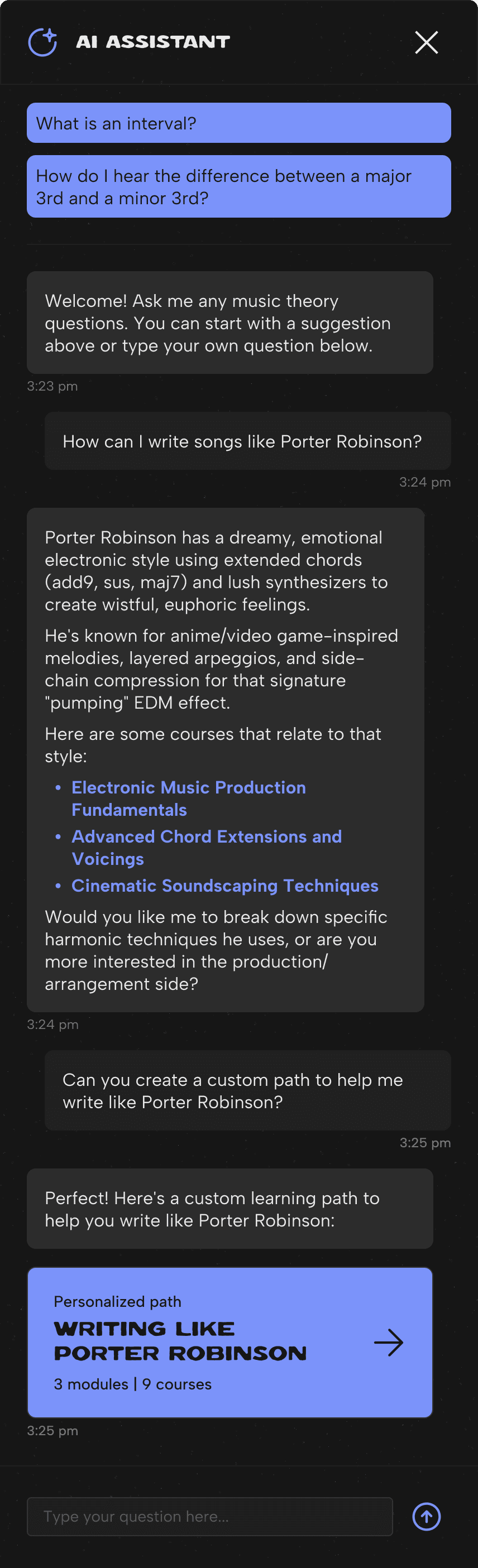 The AI chat feature allows learners to ask questions and generate custom learning paths tailored to their musical interests.